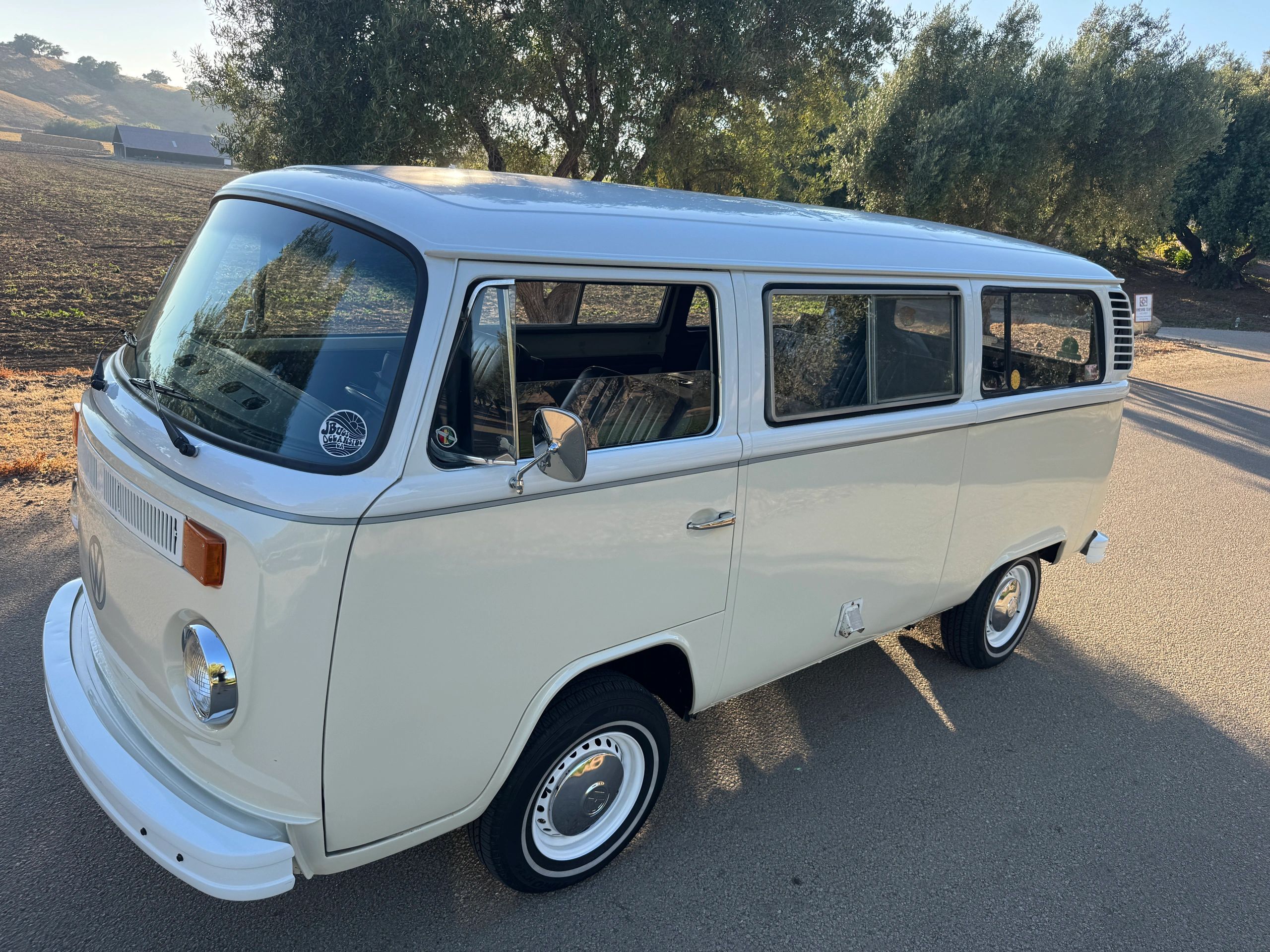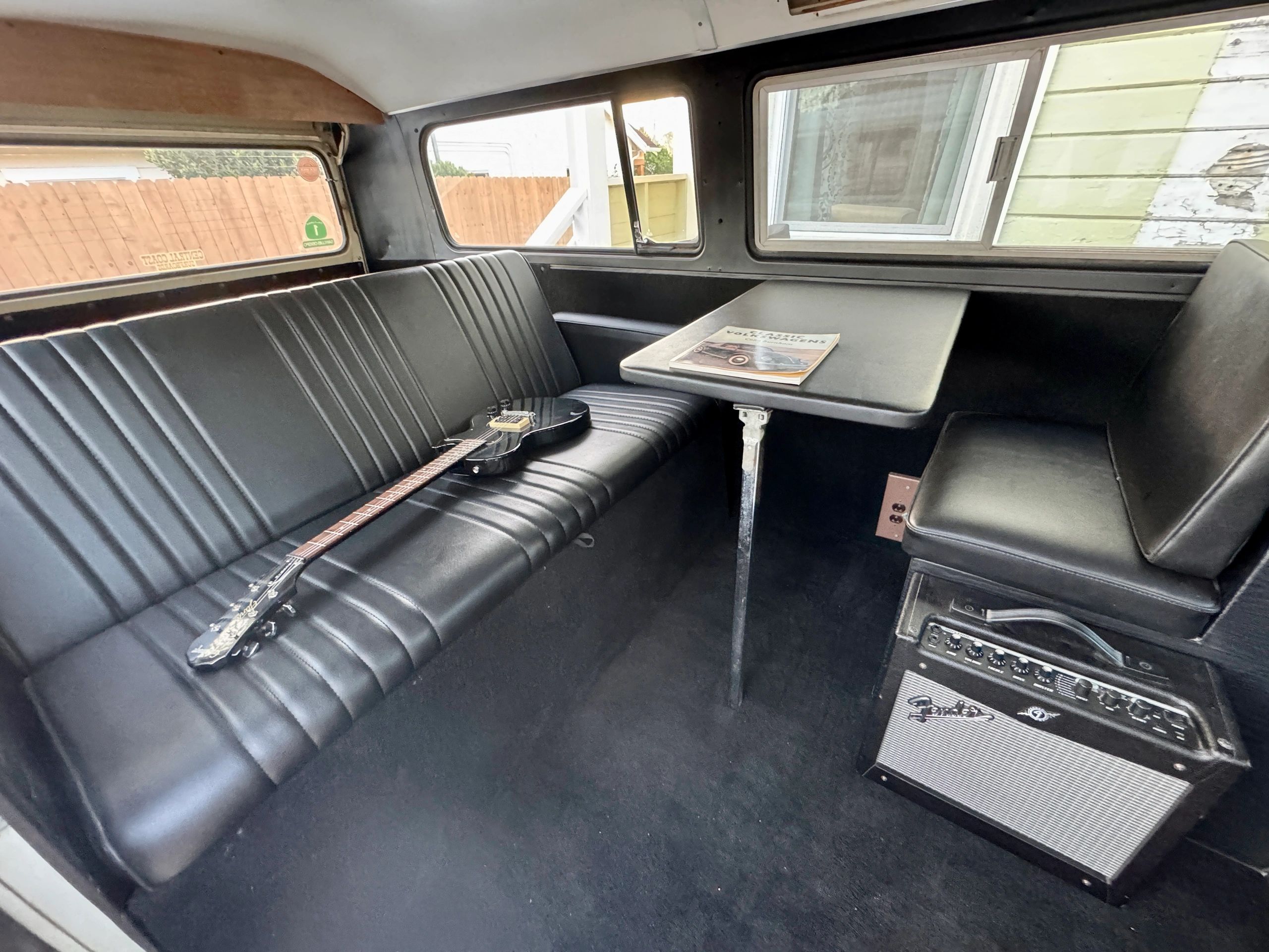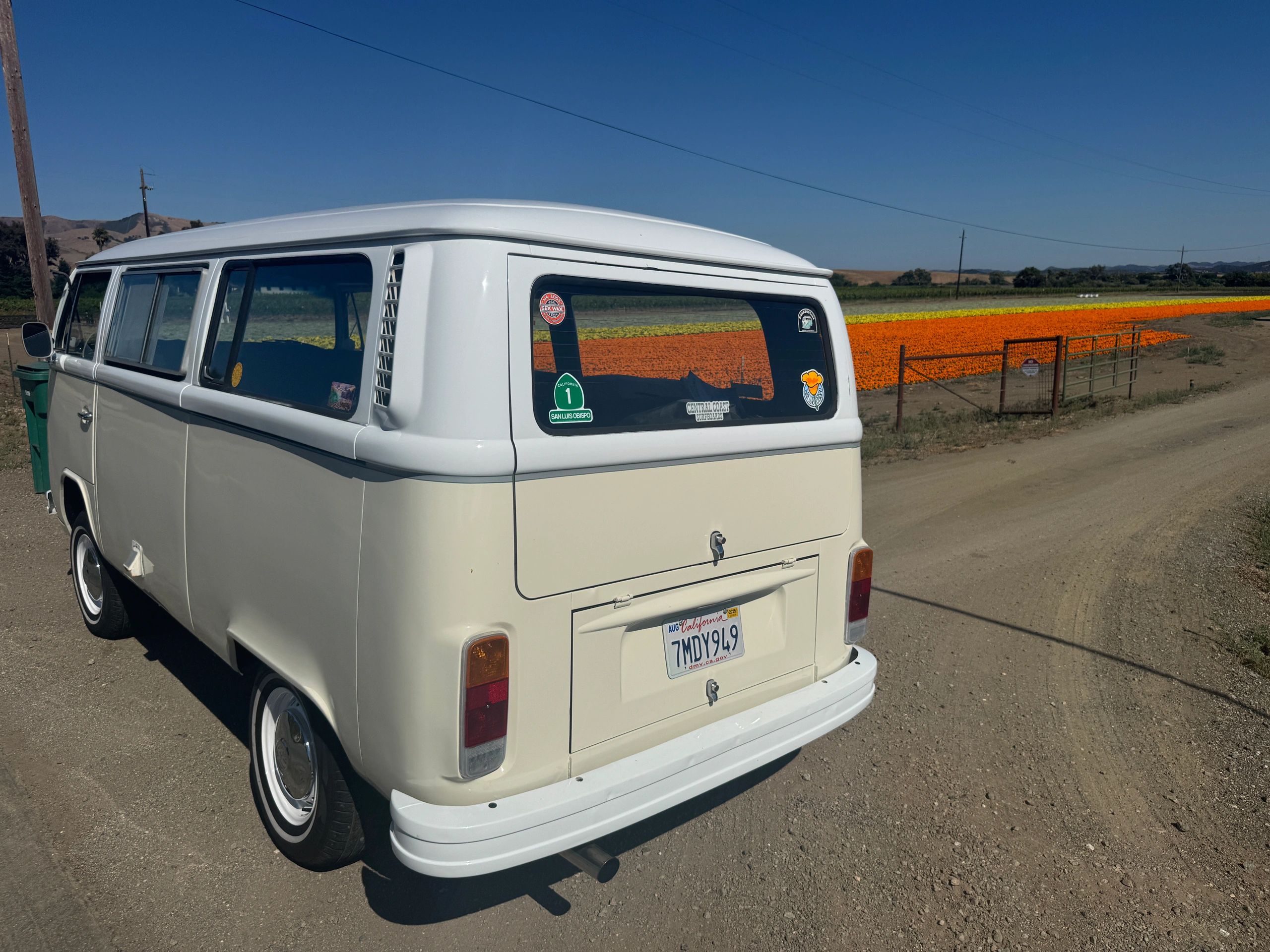 This Cream & White 1973 Volkswagen Bus is fully restored and reimagined for merch sales, marketing, media, and event use.