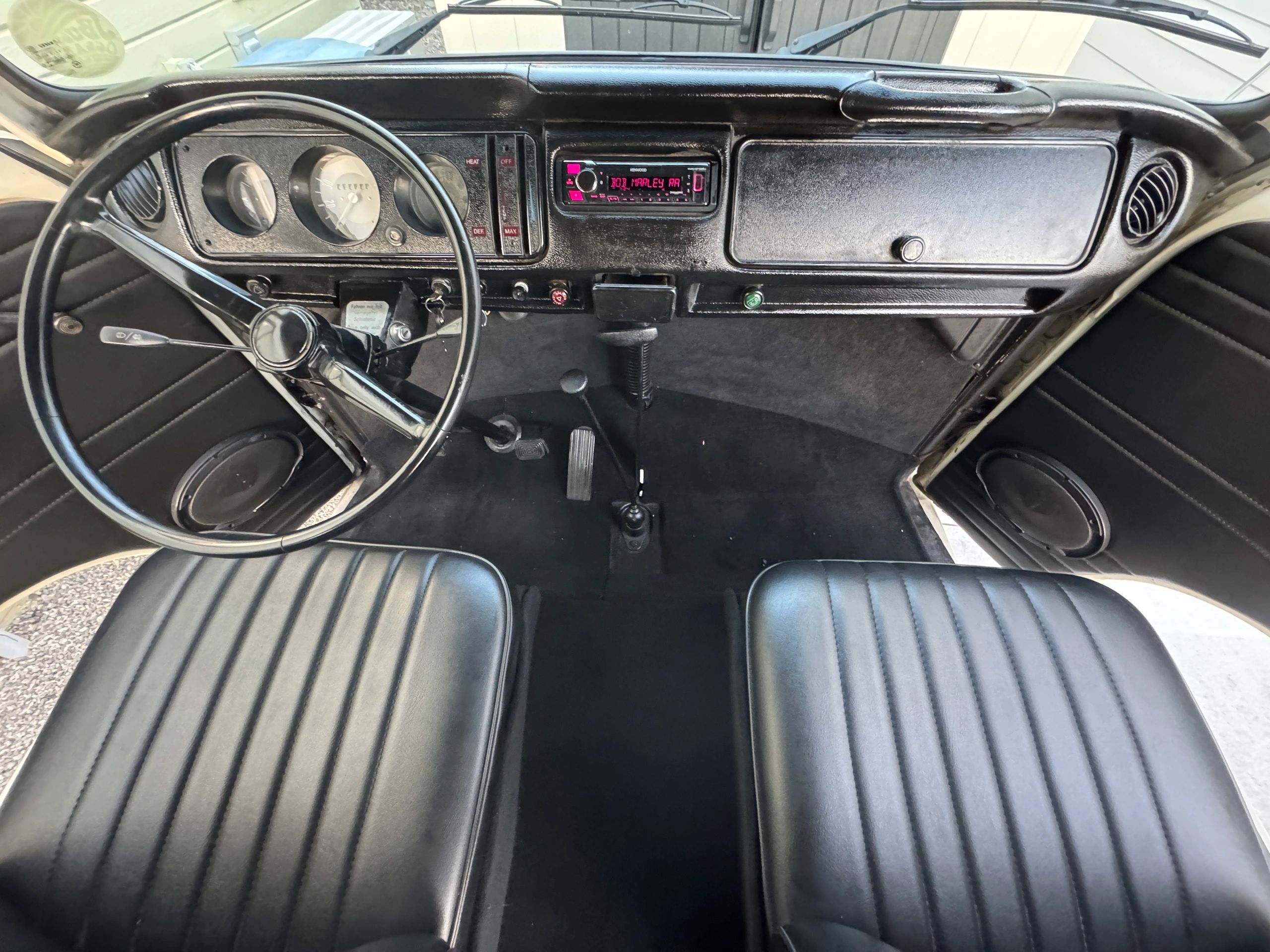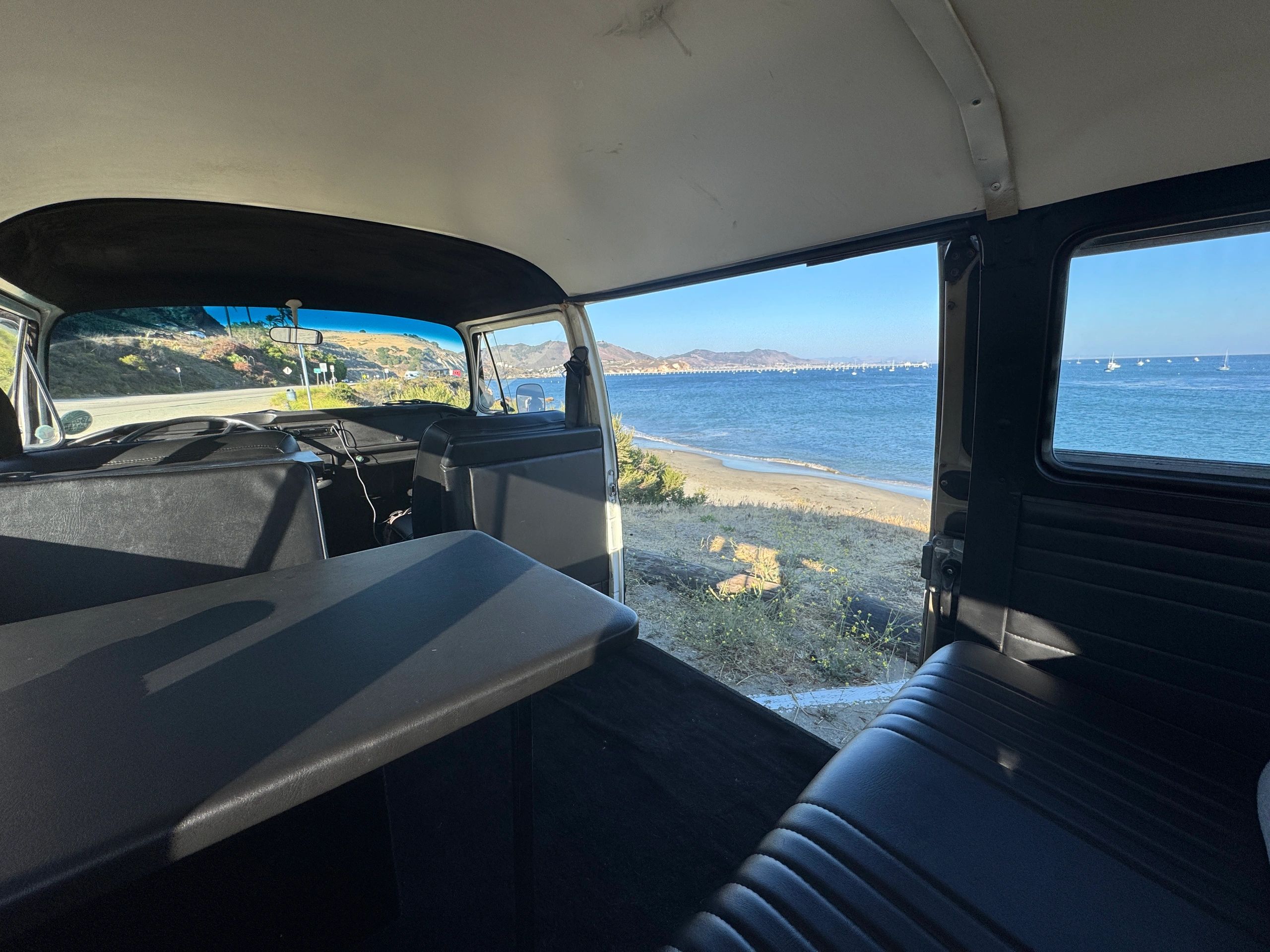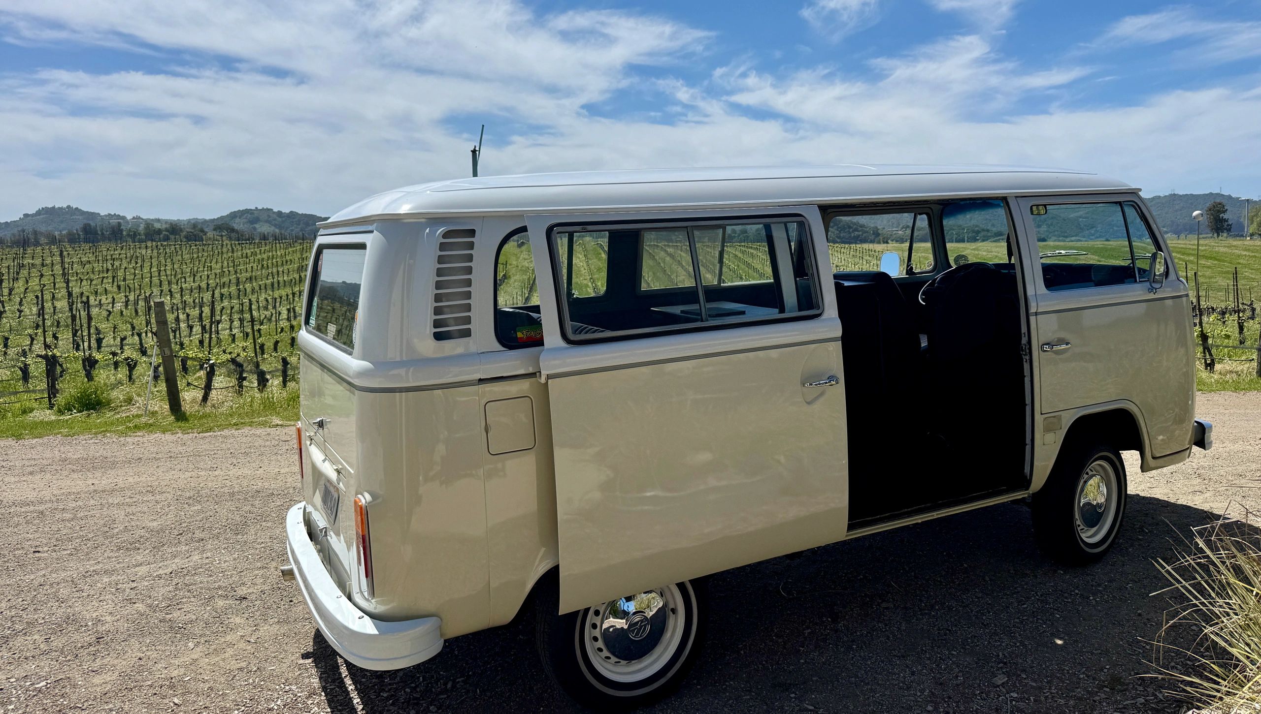 This Cream & White 1973 Volkswagen Bus is fully restored and reimagined for merch sales, marketing, media, and event use.